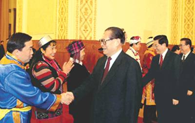 2003年3月12日晚,中共中央统战部、全国人大民族委员会、国家民族事务委员会、全国政协民族和宗教委员会在人民大会堂举行茶话会,党和国家领导人江泽民、胡锦涛、李鹏、李岚清、吴邦国、温家宝、贾庆林、曾庆红、黄菊、吴官正、李长春、罗干等同志与出席十届全国人大一次会议和全国政协十届一次会议的少数民族代表、委员们欢聚一堂,同庆“两会”的胜利召开,共话中华民族的美好未来。