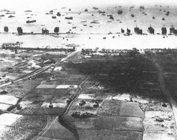 从登陆艇卸下的美军坦克隆隆地开过海岸后面的农田