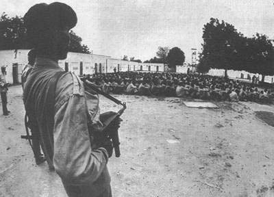 一个卫兵在首都恩贾梅纳看守被俘的叛军