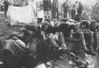 1968年8月15日-17日,在伍德斯托克举行了大型音乐节。这 次音乐节成了世界上最大规模的嬉皮士聚会,40万年轻人不顾交 通阻塞、食品与饮水短缺和倾盆大雨等因难,发疯般地随着刺耳 的音乐摇晃。他们的长发束带、穿着喇叭裤或粗布蜡染衬衫,在 泥浆里的湿睡袋中性交,吸食大麻,如同呼吸空气一般。随伍德斯托克而至的是遍及美国、欧洲及世界各地的音乐节, 年轻的嬉皮士们已将这些节目变成了一代人的团结的强有力的象 征。他们以一种极端的方式寻求人类之爱以及和平。
