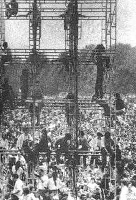 在巨大的演出平台上,音乐、诗歌朗诵通宵达旦,高音喇叭震耳欲聋,40万双舞蹈的双脚将四周踏成一片泥泞。会后,附近的农民要求政府赔偿被踩坏的田地和许多无法入睡的精神损失费。这是许多人在舞台的架子上登高远眺。