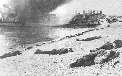迪耶普海滩上散布着加拿大士兵的尸体并有一艘运输舰残骸