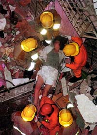 9月21日,救援人员在一栋倒塌的十二层楼房里将一名妇女救出ě^éネù!*á★ǎ。