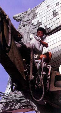 9月23日,一名工作人员坐在起重机的吊臂上对倒塌的楼房进行搜索。
