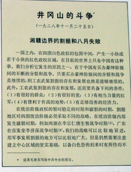 1928年11月25日,中共红军第四军前委书记毛泽东给中共中央写了报告,总结1927年下半年和1928年井冈山根据地和其他地区的武装斗争经验。毛泽东指出,红军和红色政权发生、存在和发展的原因和条件是:第一,地方性的农业经济和帝国主义划分势力范围的分裂剥削政策,造成了“白色政权间的长期的分裂和战争”,“使一小块或若干小块的共产党领导的红色区域,能够在四周围白色政权包围的中间发生和坚持下来”。第二,经过第一次大革命影响和锻炼的工农兵士,为建立革命军队和红色政权准备了良好的群众条件。第三,“中国革命形势是跟着国内买办豪绅阶级和国际资产阶级的继续的分裂和战争,而继续地向前发展的”,这样“不但小块红色区域的长期存在没有疑义,而且这些红色区域将继续发展,日渐接近于全国政权的取得”。第四,有相当力量的红军的存在,是红色政权存在的必要条件。第五,共产党组织的有力量和它的政策的正确,是红色政权长期存在和发展的最重要的条件。毛泽东强调武装斗争对于坚持长期割据局面的极端重要的意义,指出:“‘工农武装割据’的思想,是共产党的割据地方的工农群众必须充分具备的一个重要的思想。”