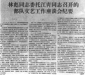 1966年2月20日,受中央军委副主席、国防部部长林彪的委托,江青在上海召集部队文艺工作座谈会,形成《部队文艺座谈会纪要》。