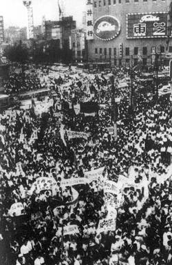 1960年6月19日,日本首相岸信介宣布《日美共同合作与安全保障条约》“自然成立”,并于6月23日在东京与美方交换批准书。岸信介的这一行动遭到日本人民强烈反对,各地先后举行声势浩大的示威游行,在这强大压力下岸信介被迫下台。
