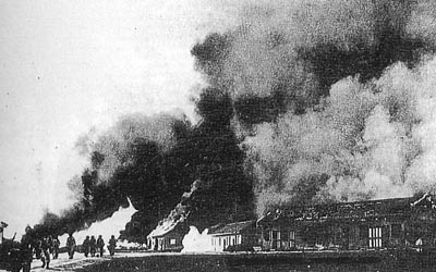 日军在攻势屡遭挫折之后,遂施火攻。利用飞机投掷大量的燃烧弹。燃烧弹落下,大火熊熊,全城一片火海,守军囤积之粮弹被焚毁,无数受伤军民被烧死,有着红十字旗帜作野战医院之忠爱社,亦未幸免,数千名重伤军民葬身火海。
