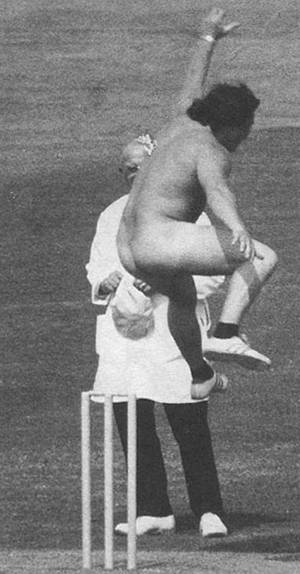 然而1975年夏季,英国却刮起了一股裸体飞跑风,如上图这位因赤条条闯入大板球场而大出风头的观众,便赋予媒介中曝光”以一种全新的意义。