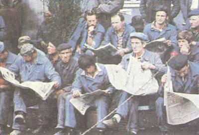 格但斯克的罢工者阅读报上的他们向官方工会的挑战书