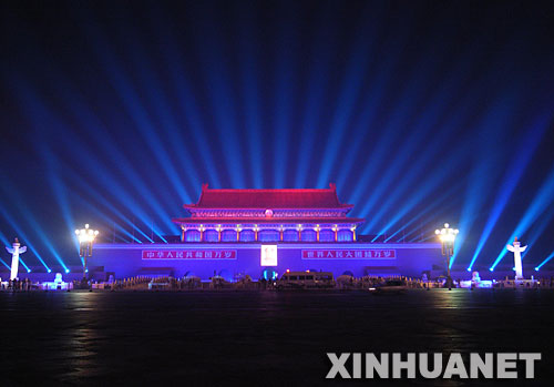 8月7日凌晨,正在调试的色彩缤纷的灯光将天安门城楼点缀得绚丽夺目。2008年奥运会倒计时一周年庆祝活动将于8月8日晚在北京天安门广场举行。 新华社记者 邢广利 摄