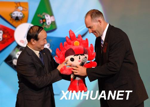 资料图片:2006年8月7日晚,北京奥组委执行副主席蒋效愚(左)向美国橄榄球大联盟委派的超级球星陆高伟赠送福娃“欢欢”。当日,“福娃全球送吉祥”第29届奥运会吉祥物海外推广活动在北京启动。新华社记者罗晓光摄