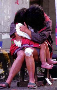 9月22日,一位母亲抱着女儿悲痛欲绝,她的丈夫和另外的孩子还埋在废墟中。